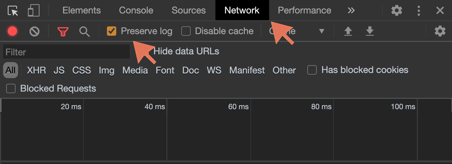 Step 2: Click on Network tab in Developer Tools. Check the "Preserve log" box at the top.