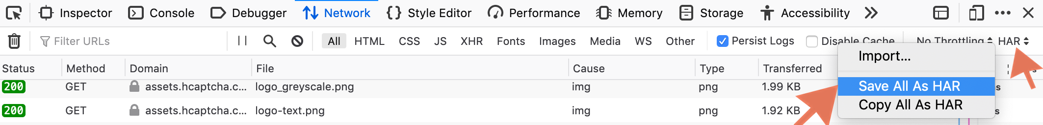 Step 4: Click "HAR" after you attempt to solve, and choose "Save All as HAR" to save the network log. Send that file to us.